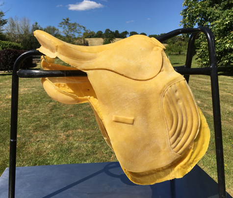 Bees wax shell casts from deconstructed saddle mould. The reconstruction rests on a saddle rack structure. This is placed in an idyllic countryside setting, set on a contrasting industrial stainless steel table top representing the urban mindset. Ambient sounds complete the scene.